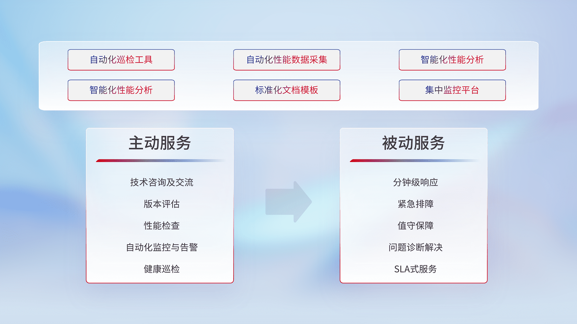 智能化工具和标准化文档,,,保障服务质量,,提供主动服务(包含技术咨询、、版本评估、、性能检查、、、自动化监控与告警、、、健康巡检)和被动服务包含(分钟级响应、、、紧急排障、、值守保障、、问题诊断解决、、、、SLA服务)。。。
